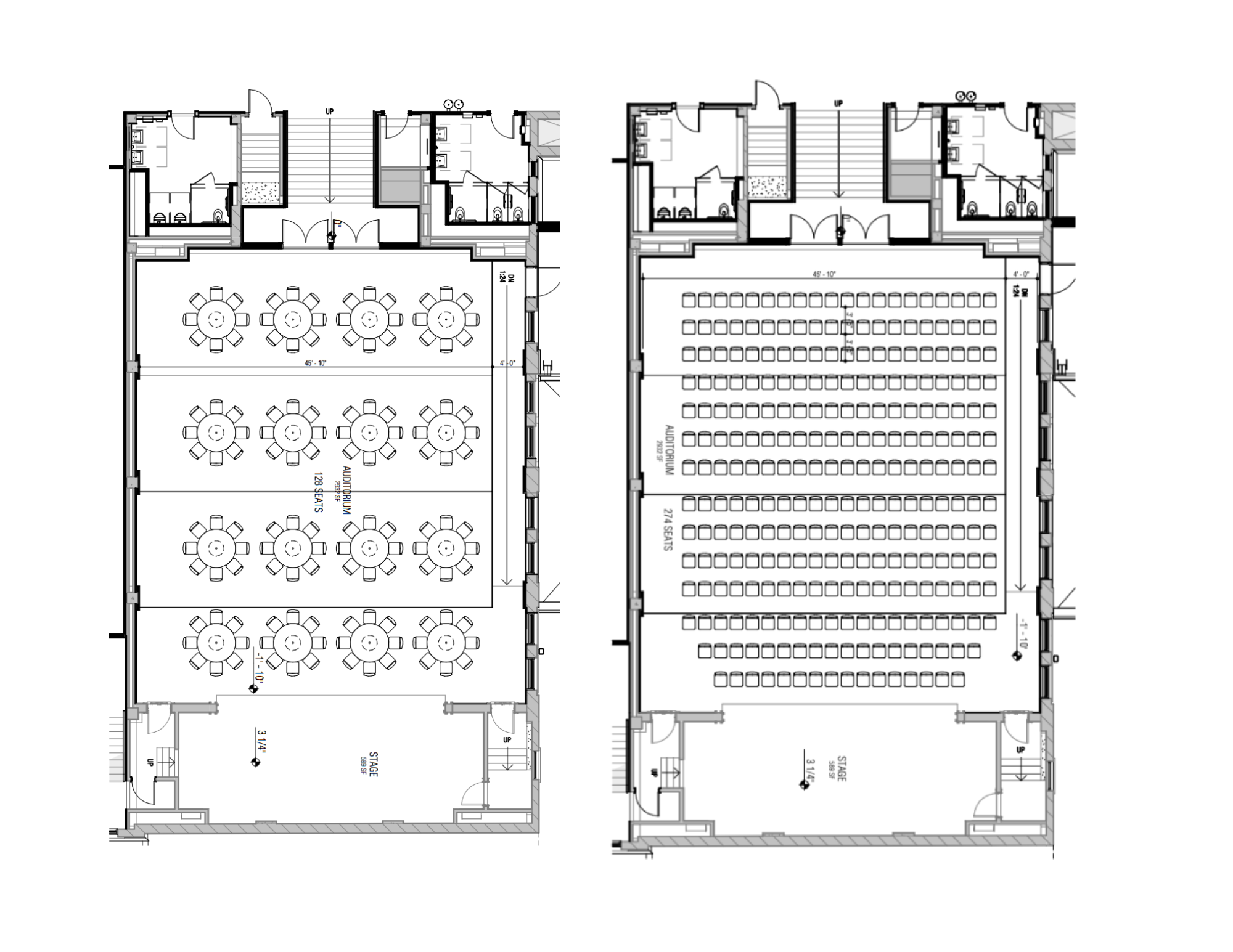 This auditorium is perfect for live performances, presentations, wedding ceremonies and corporate trainings. The layout can be customized to accommodate up to 250 guest theatre style, or mix it up with intimate seated dinners and receptions.